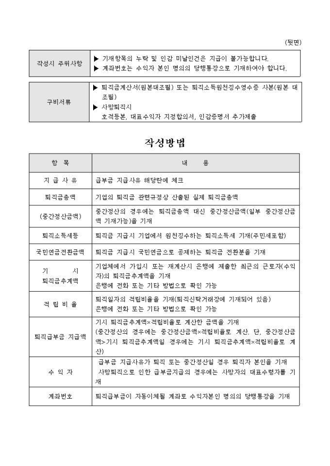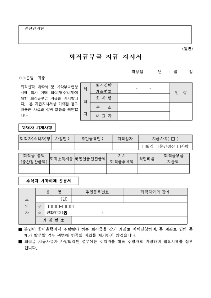 9,000원/월위탁자 기재사항(퇴직자(수익자)명, 사원번호, 주민등록번호, 퇴직일자, 지급사유), 수익자 계좌이체 신청서(수익자 성명, 주민등록번호, 퇴직자와의 관계)의 항목으로 구성된 퇴직급부금지급지시서 양식입니다.