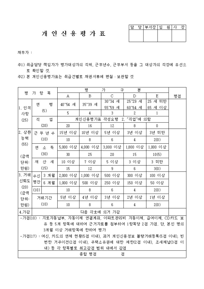 9,000원/월취급담당 책임자가 평가대상자의 직위, 근무년수, 근무부서 등을 그 대상자의 직장에 유선으로 확인해야 하고 본 개인신용평가표는 취급건별로 채권서류에 편철·보관해야하는 개인신용평가표 양식입니다.