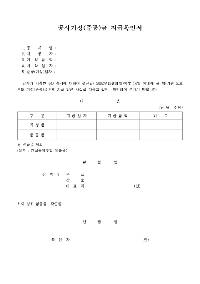 9,000원/월공사명, 시공자, 계약금액, 계약일자, 준공(예정)일자 등의 기재란으로 구성된 공사기성(준공)금지급확인서 양식입니다.