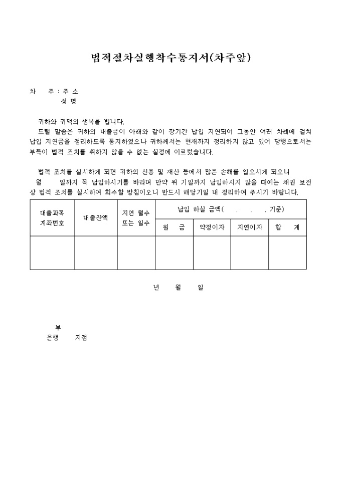 9,000원/월대출과목 계좌번호, 대출잔액, 지연 월수 또는 일수, 납입 하실 금액 등을 기재하는 법적절차실행착수통지서(차주앞) 양식입니다.