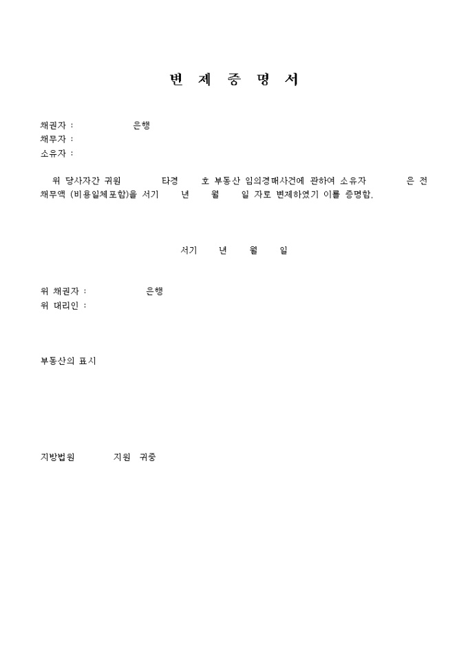 9,000원/월부동산 임의경매사건에 관하여 소유자는 전 채무액 (비용일체포함)을 서기 0000년 00월 00일 자로 변제하였기 이를 증명한 다는 내용의 변제증명서 양식입니다.