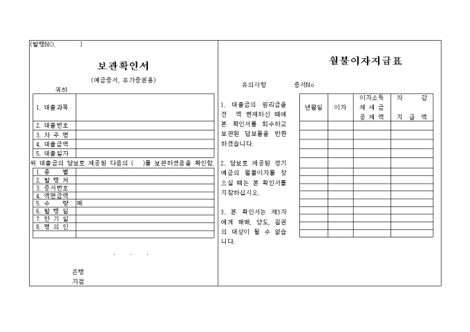 9,000원/월대출과목, 대출번호, 차주명, 대출금액, 증서번호, 차감 지급액 등을 기재하는 보관확인서,월불이자지급표 양식입니다.