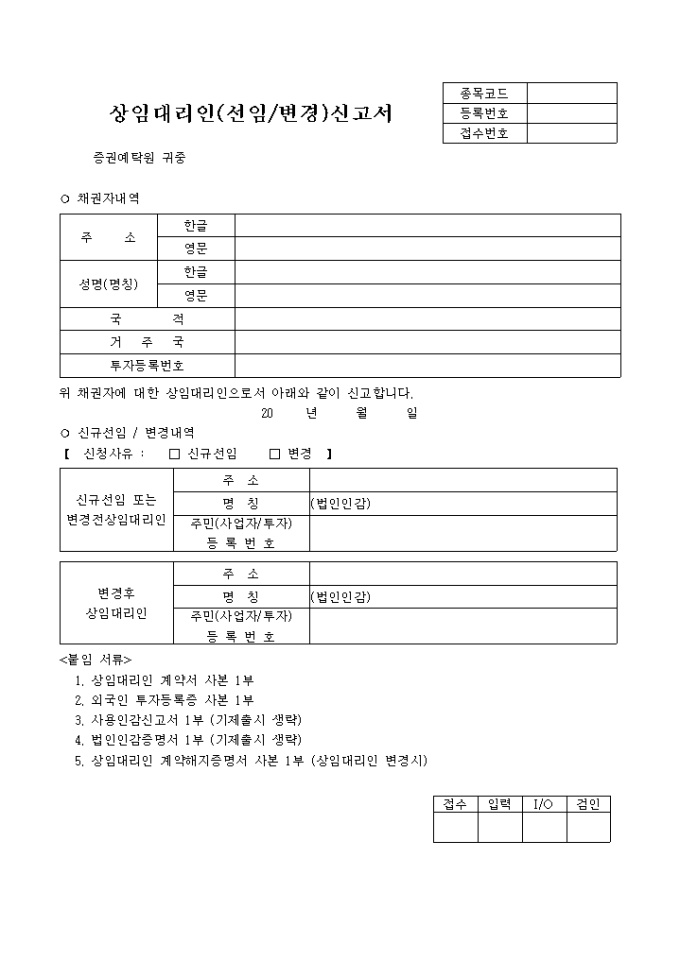 9,000원/월상임대리인 계약서 사본 1부, 외국인 투자등록증 사본 1부, 사용인감신고서 1부 (기제출시 생략), 법인인감증명서 1부 (기제출시 생략), 상임대리인 계약해지증명서 사본 1부 (상임대리인 변경시)가 첨부되야는 하는 상임대리인(선임변경)신고서 양식입니다.