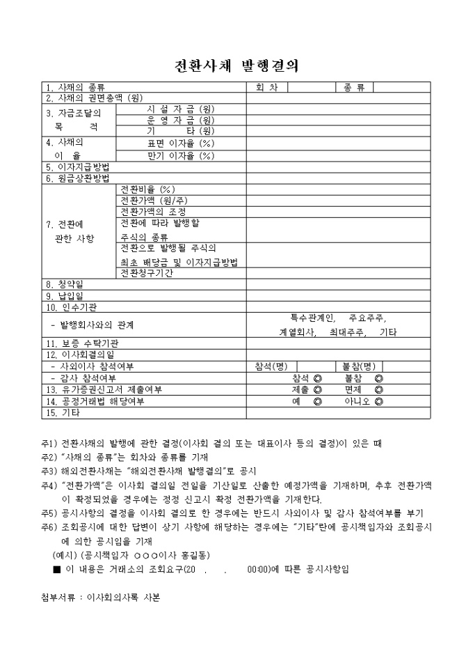 9,000원/월사채의 종류, 사채의 권면총액, 자금조달의 목적, 사채의 이율, 이자지급방법, 원금상환방법, 전환에 관한 사항, 청약일, 납입일 등을 기재하는 전환사채발행결의 양식입니다.