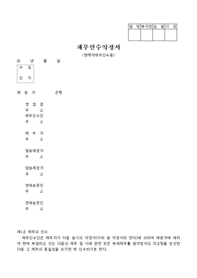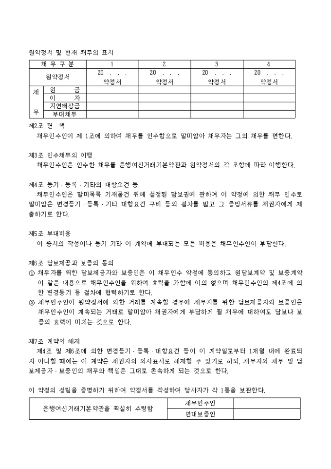 9,000원/월채무인수인은 채무자가 약정서에 의하여 채권자에 대하여 현재 부담하고 있는 채무 및 이에 관한 모든 부대채무를 원약정서의 각조항을 승인한 다음 그 채무의 동일성을 유지한 채 인수하기로 한다는 내용의 채무인수약정서(면책적채무인수용) 양식입니다.
