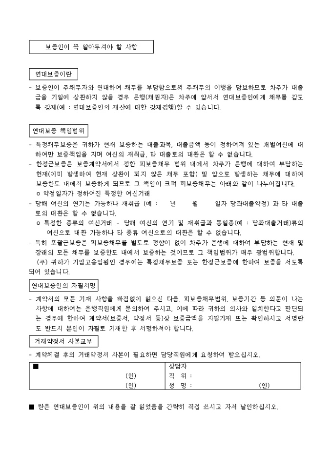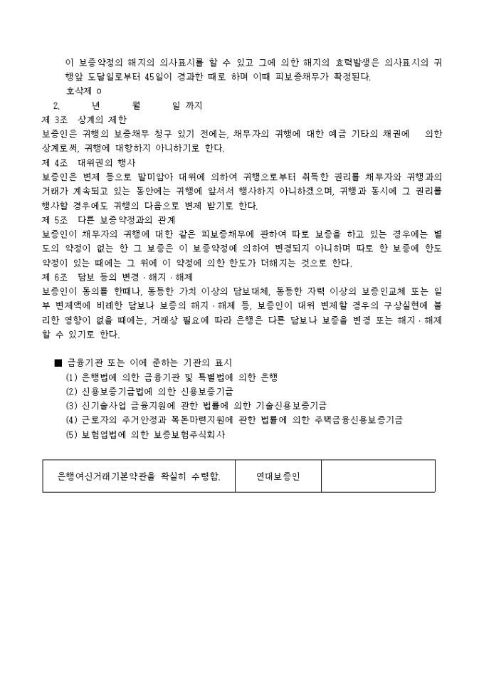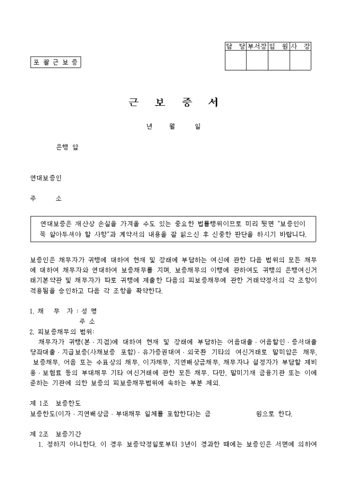 9,000원/월제 1조 보증한도, 제 2조 보증기간, 제 3조 상계의 제한, 제 4조 대위권의 행사, 제 5조 다른 보증약정과의 관계, 제 6조 담보 등의 변경ㆍ해지ㆍ해제의 5개의 조항으로 구성된 포괄근보증(근보증서) 양식입니다.