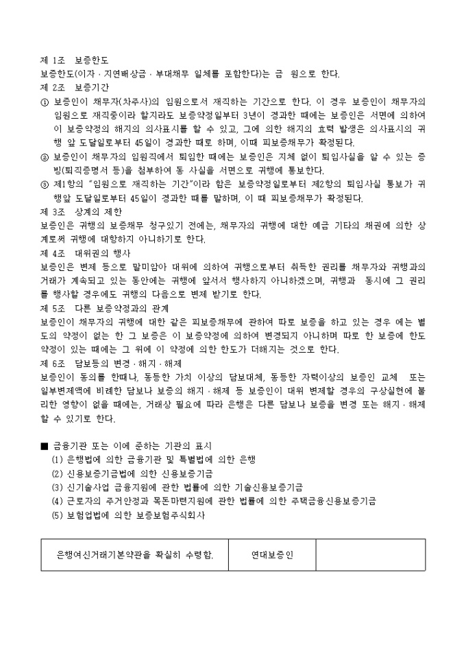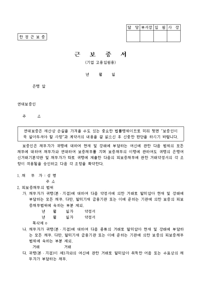 9,000원/월제 1조 보증한도, 제 2조 보증기간, 제 3조 상계의 제한, 제 4조 대위권의 행사 외 2개의 조항으로 구성된 한정근보증(기업고용임원용)근보증서 양식입니다.