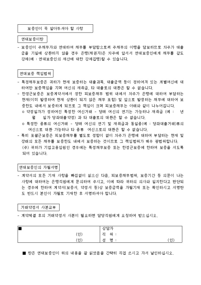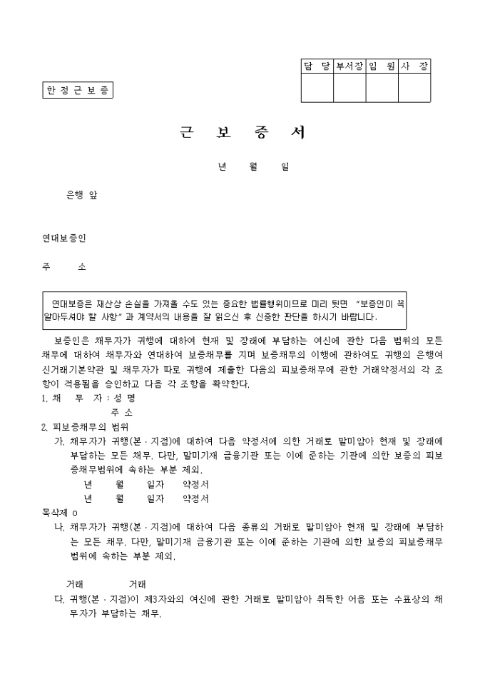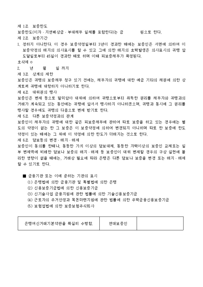 9,000원/월제 1조 보증한도, 제 2조 보증기간, 제 3조 상계의 제한, 제 4조 대위권의 행사, 제 5조 다른 보증약정과의 관계, 제 6조 담보등의 변경ㆍ해지ㆍ해제의 6개의 조항으로 구성된 한정근보증 양식입니다.