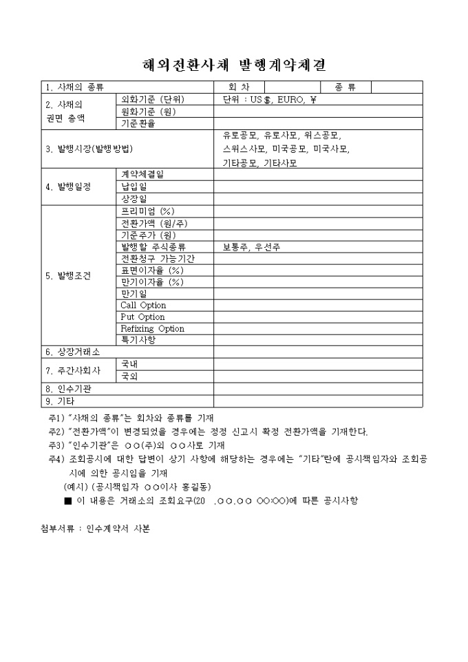 9,000원/월사채의 종류, 사채의 권면총액, 발행시장(발행방법), 발행일정, 발행조건, 상장거래소, 주간사회사 등을 기재하는 해외전환사채발행계약체결 양식입니다.