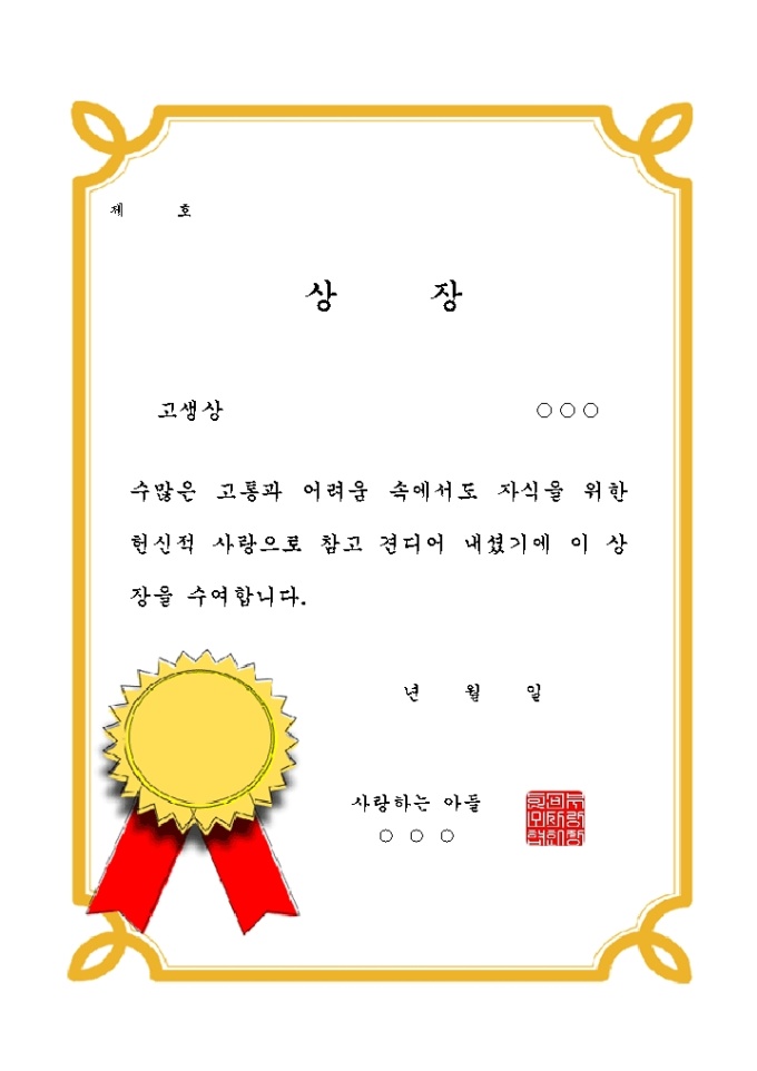 9,000원/월부모님상장(고생상)입니다. 아이가 부모님에게 그동안 낳아주시고 키워주셔서 감사하다는 의미로 드리는 이미지가 첨부된 상장입니다.