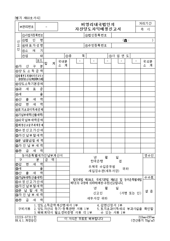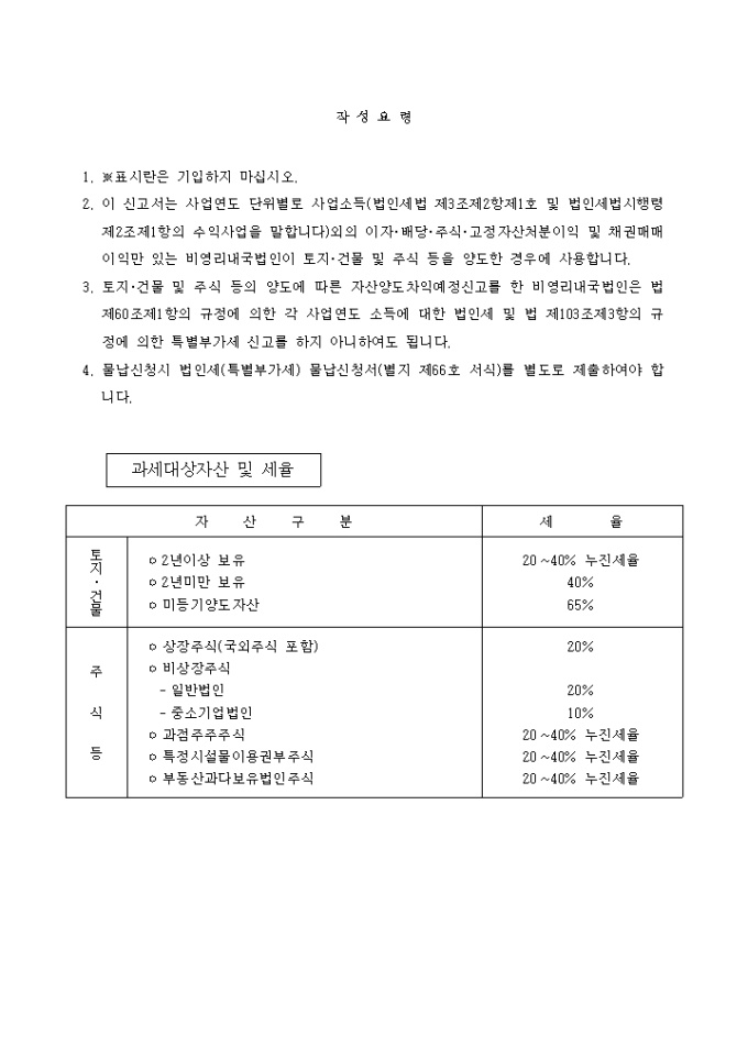 9,000원/월[별지 제60호서식] 자산양도차익예정신고서 양식입니다. [작 성 요 령] 1. ※표시란은 기입하지 마십시오. 2. 이 신고서는 사업연도 단위별로 사업소득(법인세법 제3조제2항제1호 및 법인세법시행령 제2조제1항의 수익사업을 말합니다)외의 이자 배당 주식 고정자산처분이익 및 채권매매이익만 있는 비영리내국법인이 토지 건물 및 주식 등을 양도한 경우에 사용합니다. 3. 토지 건물 및 주식 등의 양도에 따른 자산양도차익예정신고를 한 비영리내국법인
