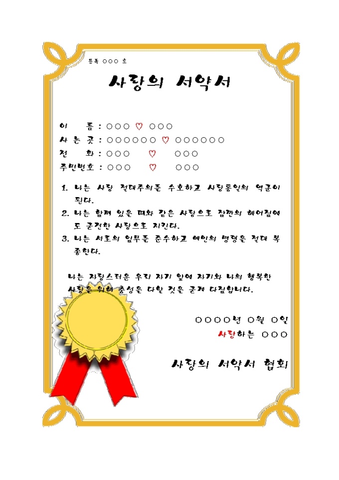 사랑의서약서(상장테두리형)입니다. 상장 테두리 이미지가 삽입된 서로의 사랑을 변치 않겠다고 약속하는 서약서 양식의 이색서식입니다.