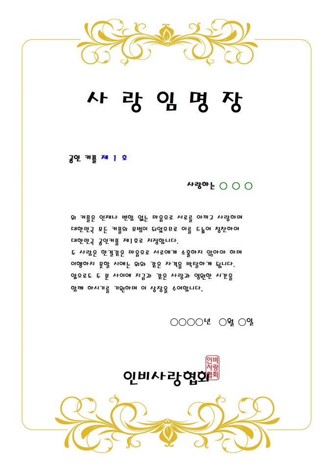 9,000원/월사랑임명장입니다. 커플은 언제나 변함 없는 마음으로 서로를 아끼고 사랑하며 대한민국 모든 커플의 모범이 되었으므로 이를 드높여 칭찬하여 대한민국 국가 공인커플 제1호로 지정하는 내용입니다.