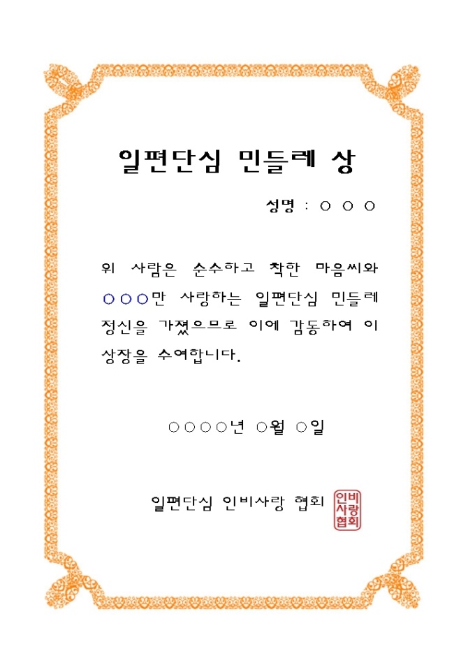 9,000원/월연인상장(일편단심민들레상)입니다. 서로의 연인에게 주는 상장으로 자신만 바라봐 준 것에 감사하는 뜻이 담긴 상장입니다. 상장 이미지가 삽입되어 있습니다.