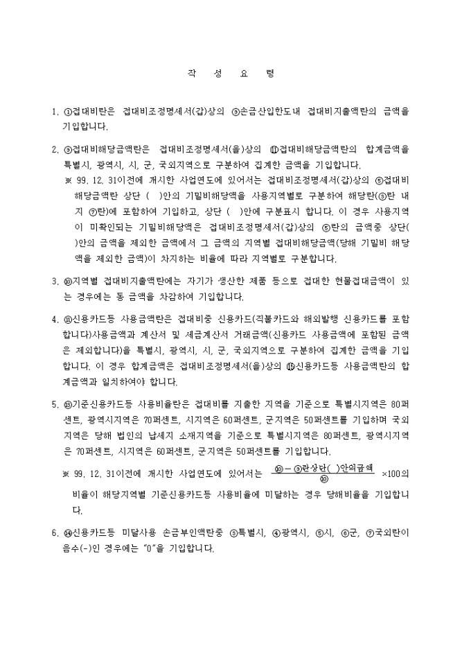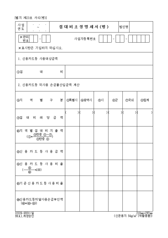 9,000원/월[별지 제23호 서식(병)] 접대비조정명세서(병) 양식입니다. [작 성 요 령] 1. 접대비란은 접대비조정명세서(갑)상의 손금산입한도내 접대비지출액란의 금액을 기입합니다. 2. 접대비해당금액란은 접대비조정명세서(을)상의 접대비해당금액란의 합계금액을 특별시, 광역시, 시, 군, 국외지역으로 구분하여 집계한 금액을 기입합니다. ※ 99. 12. 31이전에 개시한 사업연도에 있어서는 접대비조정명세서(갑)상의 접대비