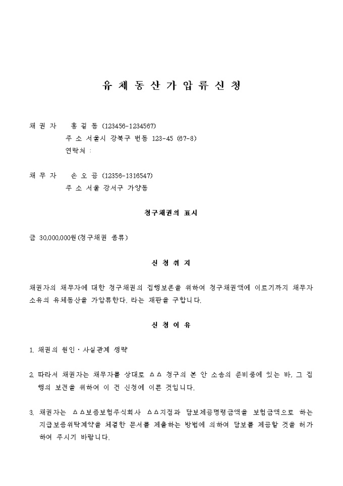 9,000원/월유체동산가압류 입니다. 신 청 취 지 채권자의 채무자에 대한 청구채권의 집행보존을 위하여 청구채권액에 이르기까지 채무자소유의 유체동산을 가압류한다. 라는 재판을 구합니다. ...