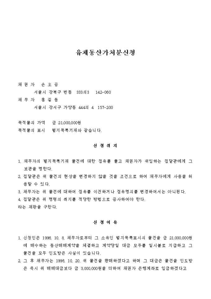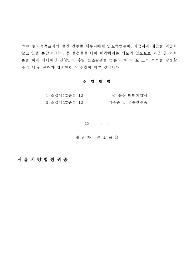 9,000원/월유체동산가처분신청 입니다. 신 청 취 지 1. 채무자의 별지목록기재 물건에 대한 점유를 풀고 채권자가 위임하는 집달관에게 그 보관을 명한다. 2. 집달관은 위 물건의 현상을 변경하지 않을 것을 조건으로 하여 채무자에게 사용을 허용할 수 있다. 3. 채무자는 위 물건에 대하여 점유를 이전하거나 점유명의를 변경하여서는 아니된다. 4. 집달관은 위 명령의 취지를 적당한 방법으로 공사하여야 한다. 라는 재판을 구한다. ...