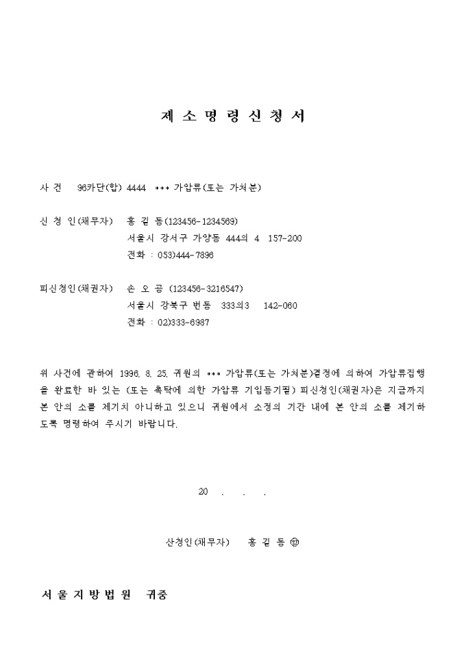 9,000원/월제소명령신청서 입니다. 위 사건에 관하여 1996. 8. 25. 귀원의 ᄆᄆᄆ 가압류(또는 가처분)결정에 의하여 가압류집행을 완료한 바 있는 (또는 촉탁에 의한 가압류기입등기필) 피신청인(채권자)은 지금까지 본안의 소를 제기치 아니하고 있으니 귀원에서 소정의 기간내에 본안의 소를 제기하도록 명령하여 주시기 바랍니다 ...