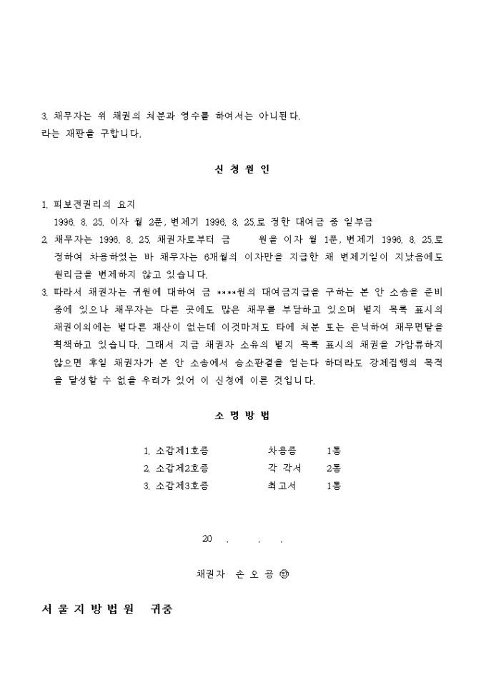 9,000원/월채권가압류신청 입니다. 신 청 취 지 1. 채권자가 채무자에 대하여 가지고 있는 위 청구채권의 집행을 보전하기 위하여 채무자의 제3채무자에 대한 별지목록 표시의 채권을 가압류한다. 2. 제3채무자는 채무자에 대하여 위의 지급을 하여 서는 아니된다. 3. 채무자는 위 채권의 처분과 영수를 하여 서는 아니된다. 라는 재판을 구합니다. ...