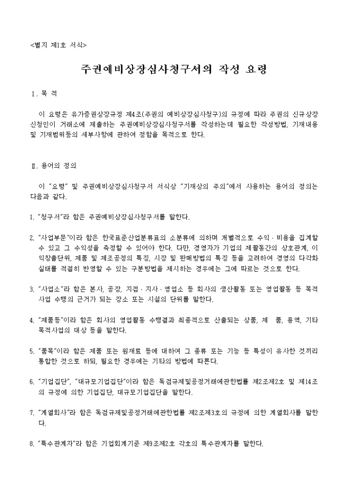 9,000원/월주권예비상장심사청구서의작성요령입니다. 당사의 주권을 신규로 상장하고자 유가증권상장규정 제4조의 규정에 의거하여 당사 주권의 예비상장심사를 청구할때 작성하는 청구서의 작성요령입니다.