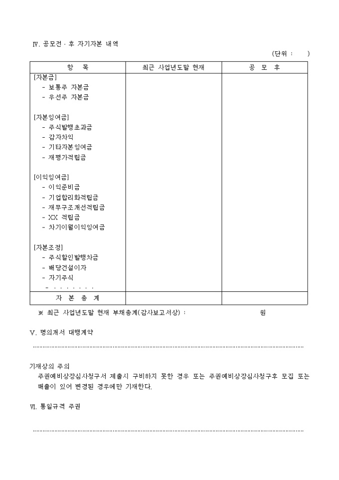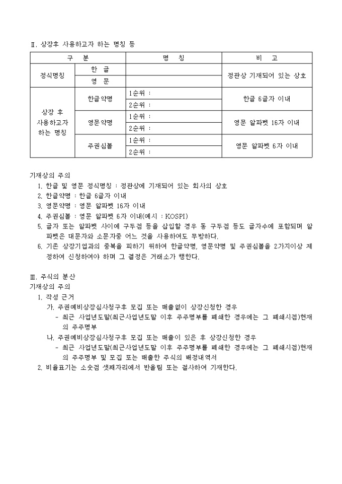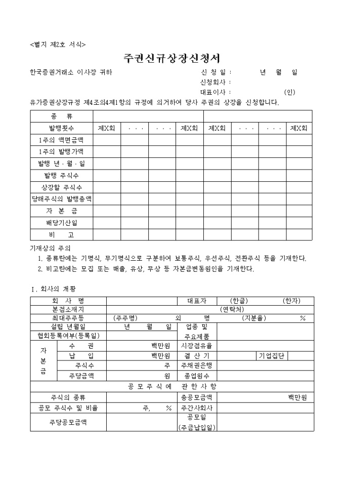 9,000원/월주권신규상장신청서입니다 유가증권상장규정 제4조의4제1항의 규정에 의거하여 당사 주권의 상장을 신청하는 내용의 서식입니다.