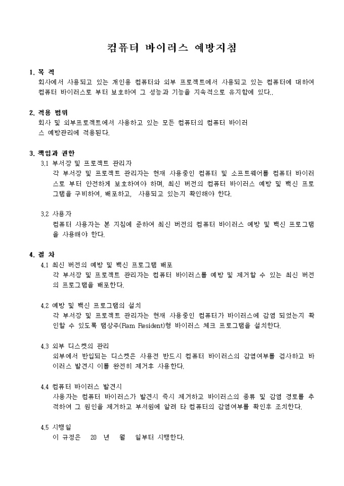 9,000원/월목적, 적용범위, 책임과 권한, 최신버전의 예방 및 백신 프로그램 배포, 예방 및 백신 프로그램의 설치, 외부 디스켓의 관리 등에 관한 절차로 구성되어 있는 컴퓨터 바이러스 예방 지침에 관한 서식입니다.