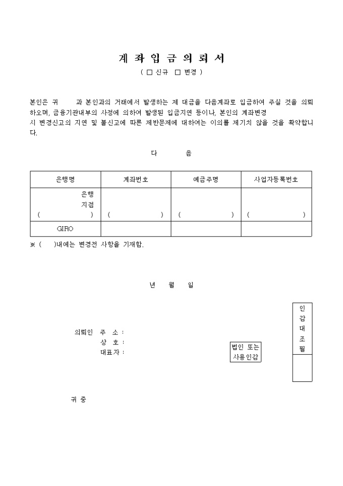 9,000원/월계좌입금의뢰서입니다. 본인과의 거래에서 발생하는 제 대금을 다음계좌로 입금하여 주실 것을 의뢰하오며, 금융기관내부의 사정에 의하여 발생된 입금지연 등이나, 본인의 계좌변경시 변경신고의 지연 및 불신고에 따른 제반문제에 대하여 는 이의를 제기치 않을 것을 확약하는 내용입니다.