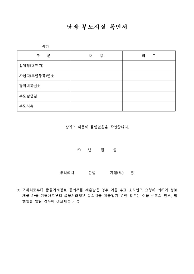 9,000원/월당좌부도 사실확인서입니다. 업체명, 사업자번호, 당좌계좌번호, 부도발생일, 부도사유 등을 기입하여 당좌부도에 대한 사실을 확인, 증명하는 서식입니다.