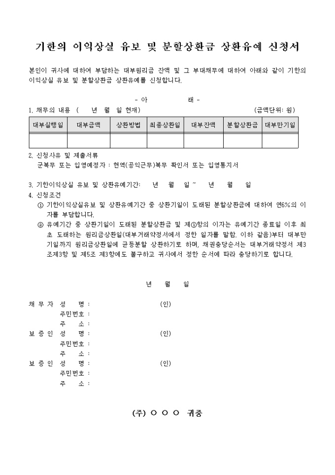 9,000원/월기한의이익상실유보및분할상환금상환유예신청서입니다. 본인이 귀사에 대하여 부담하는 대부원리금 잔액 및 그 부대채무에 대하여 아래와 같이 기한의 이익상실 유보 및 분할상환금 상환유예를 신청하는 내용입니다.