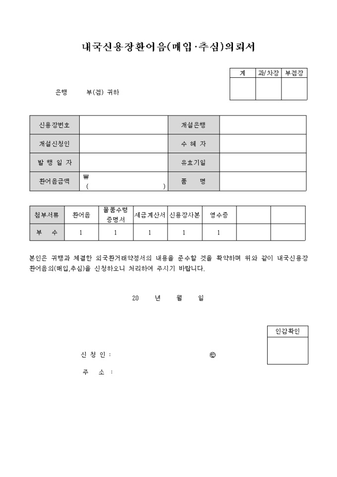 9,000원/월내국신용장환어음매입추심신청서입니다. 본인은 귀행과 체결한 외국환거래약정서의 내용을 준수할 것을 확약하며 위와 같이 내국신용장환어음의(매입, 추심)을 신청하는 서식입니다.