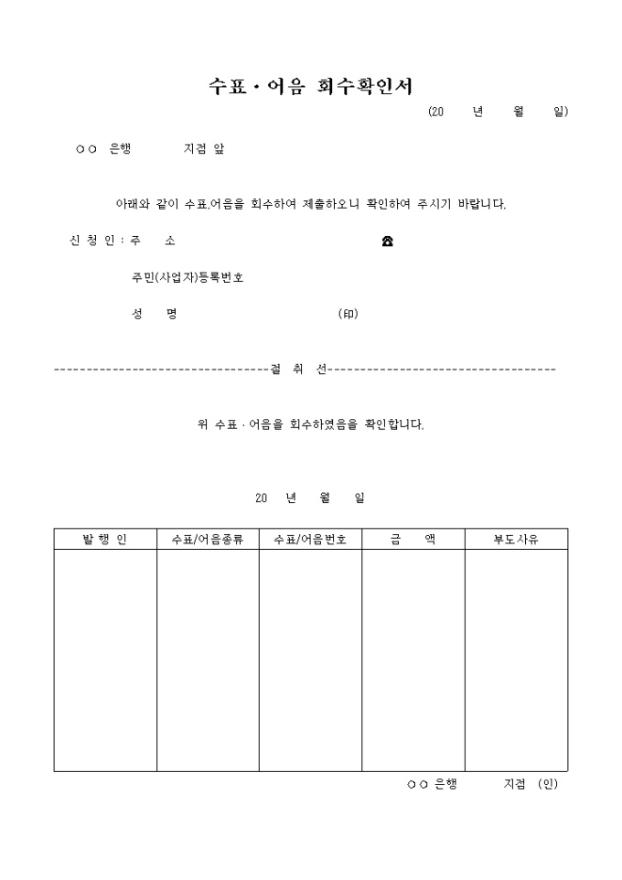 9,000원/월수표,어음회수확인서입니다. 아래에 명시되어 있는 수표의 내용으로 수표.어음을 회수하여 제출하오니 확인하여 달라는 내용의 확인서 입니다.