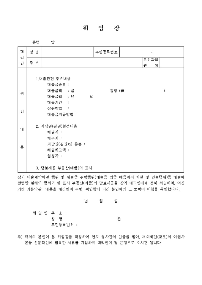 9,000원/월위임장(해외체류자용)입니다. 상기 대출계약체결 행위 및 대출금 수령행위(대출금 입금 예금계좌 개설 및 인출행위)등 대출에 관련한 일체의 행위와 위 표시 부동산(예금)의 담보제공을 상기 대리인에게 정히 위임하며, 여신거래 기본약관 내용을 대리인이 수령, 확인함에 따라 본인에게 그 효력이 미침을 확인하는 위임장입니다.