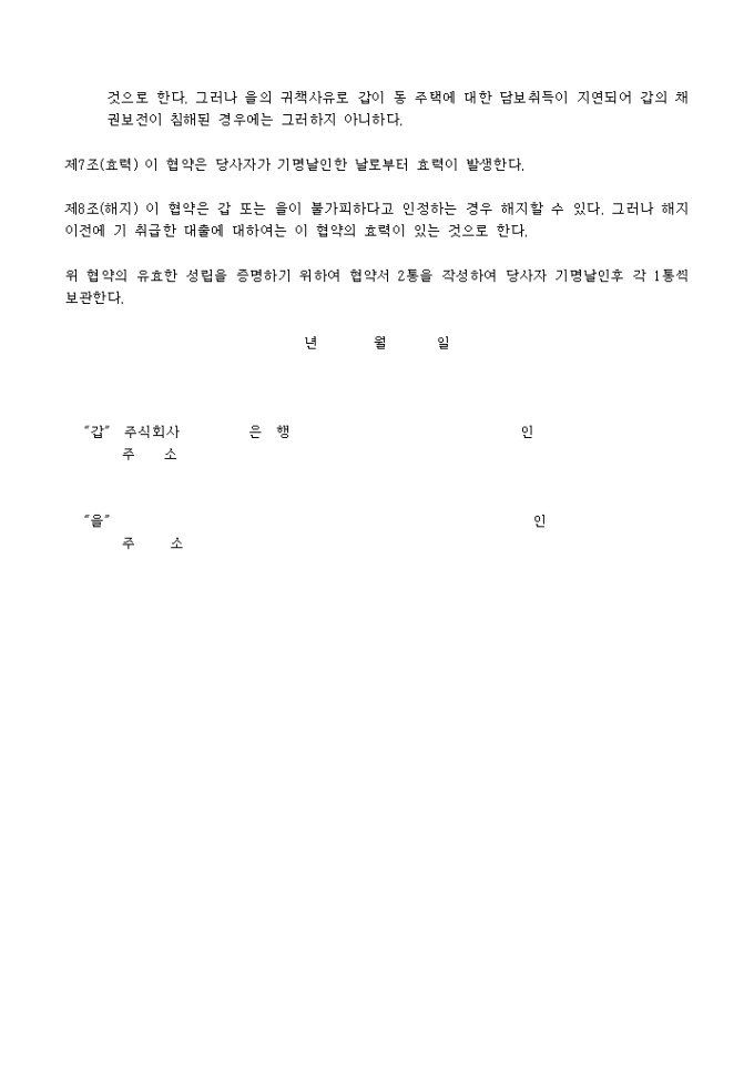 9,000원/월협약서(분양자금대출용)입니다. 주식회사 은행(이하 갑이라 한다)과 (이하 을이라 한다)는 을이 시공하는 주택의 분양대금에 충당코자 외 명(별지명단)(이하 병이라 한다)이 갑으로 부터 대출을 받음에 있어 다음과 같이 협약하는 서식입니다.