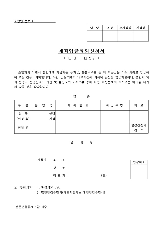 9,000원/월계좌입금의뢰신청서입니다. 조합과의 거래시 본인에게 지급되는 융자금, 환불수수료 등 제 지급금을 아래 계좌로 입금하여 주실 것을 의뢰합니다. 다만, 금융기관의 내부사정에 의하여 발생된 입금지연이나, 본인의 계좌 변경시 변경신고의 지연 및 불신고와 기재오류 등에 따른 제반문제에 대하여 는 이의를 제기치 않을 것을 확약하는 내용입니다.