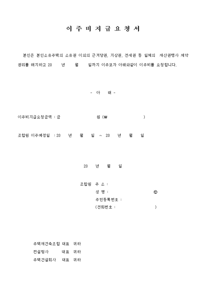 9,000원/월이주비지급요청서입니다. 본인은 본인소유주택의 소유권 이외의 근저당권, 지상권, 전세권 등 일체의 재산권행사 제약권리를 해지하고 20 년 월 일까지 이주코자 아래와같이 이주비를 요청하는 서식입니다.