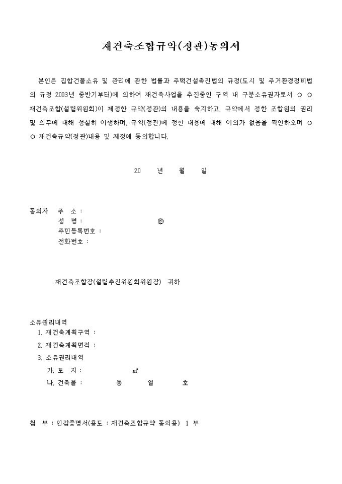 9,000원/월재건축조합규약(정관)동의서입니다. 제정한 규약(정관)의 내용을 숙지하고, 규약에서 정한 조합원의 권리 및 의무에 대해 성실히 이행하며, 규약(정관)에 정한 내용에 대해 이의가 없음을 확인하오며 ○ ○ 재건축규약(정관)내용 및 제정에 동의하는 서식입니다.