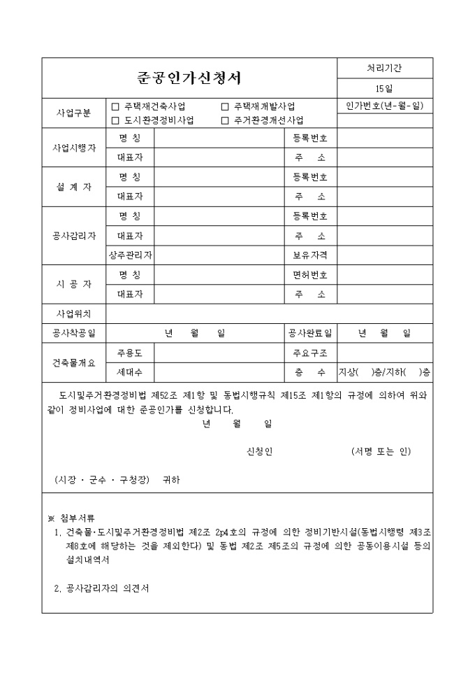9,000원/월준공인가신청서입니다. 도시 및 주거환경정비법 제52조 제1항 및 동법시행규칙 제15조 제1항의 규정에 의하여 위와 같이 정비사업에 대한 준공인가를 신청하는 양식입니다.