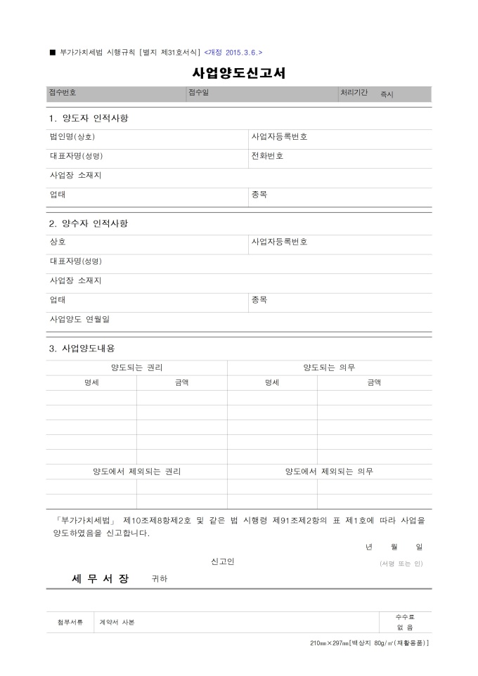 9,000원/월[별지 제31호 서식] 사업양도신고서 양식입니다. ※출처 : 기획재정부 부가가치세법 제6조 제6항 및 동법시행령 제65조 제1항 제2호의 규정에 의하여 사업을 양도 하였음을 신고하실때 사용하는 양식입니다.