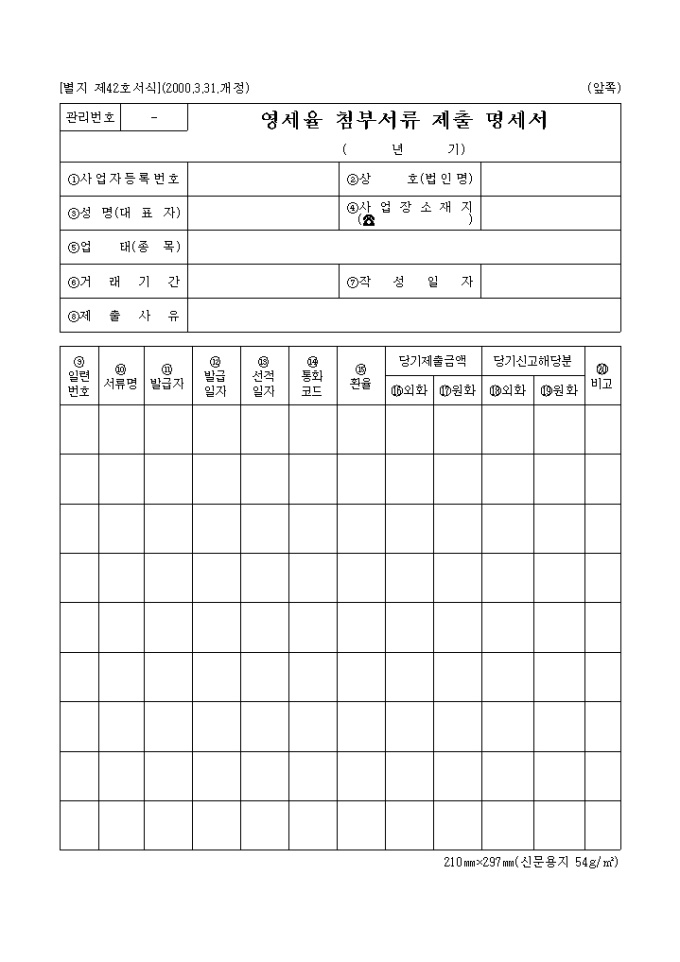 9,000원/월[별지 제42호서식] 영세율첨부서류제출명세서 양식입니다. 일련번호, 서류명, 발급자, 발급일자, 선적일자, 통화코드, 환율등의 항목으로 구성된 양식입니다.