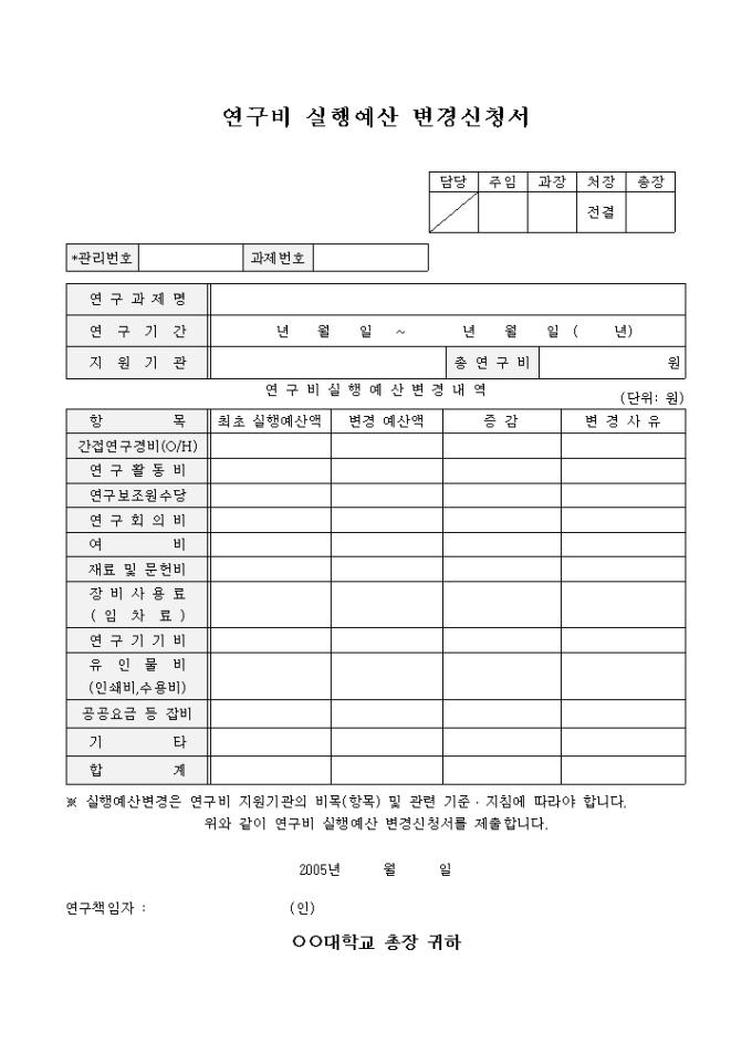 9,000원/월연구비 실행예산 변경신청서