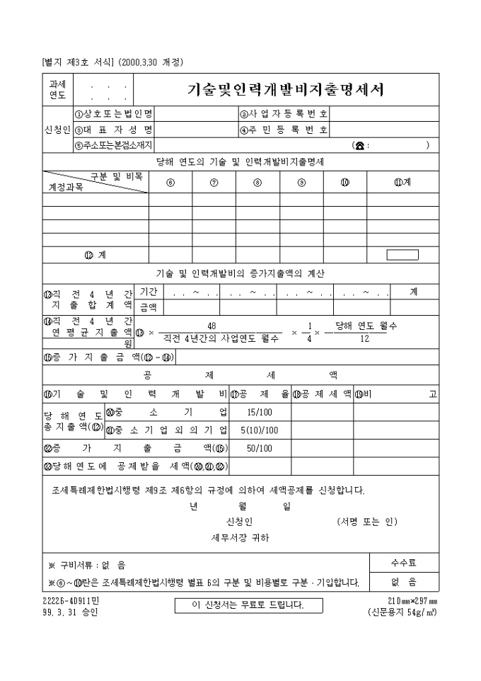 9,000원/월[별지 제3호 서식] 기술및인력개발비지출명세서 양식입니다. 조세특례제한법시행령 제9조 제6항의 규정에 의하여 세액공제를 신청하실때 사용하는 양식입니다.