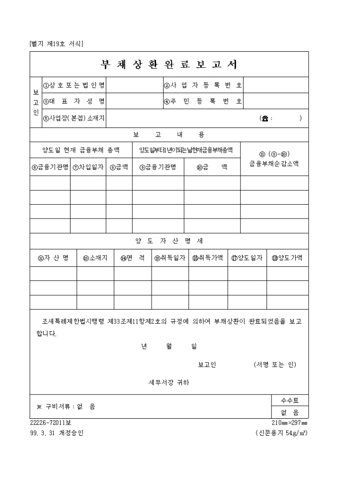 9,000원/월[별지 제19호 서식] 부채상환완료보고서 양식입니다. 조세특례제한법시행령 제33조제11항제2호의 규정에 의하여 부채상환이 완료되었음을 보고하실때 사용하는 양식입니다.