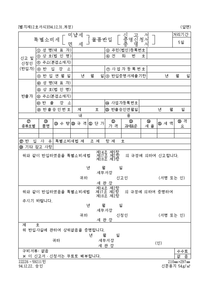 9,000원/월[별지제12호서식] 특별소비세(미납세,면세)물품반입(신청서,증명(신청)서) 양식입니다. 반입하였음을 특별소비세법 제14조 제5항, 제17조 제2항, 제18조 제3항의 규정에 의하여 신고하실때 사용하는 양식입니다.