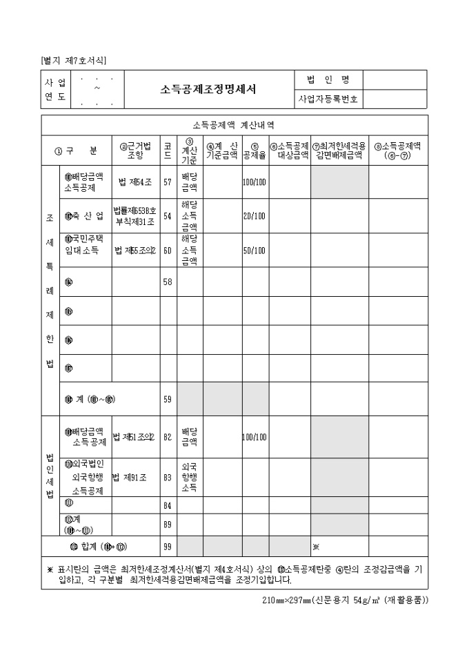 9,000원/월소득공제 조정명세서는 조세특례제한법, 법인세법에 대한 소득공제액 계산내역을 기재할 수 있독록 구성되어 있습니다.
