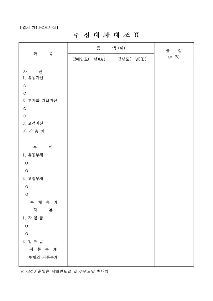 9,000원/월각 과목(자산, 부채)의 금액(당해년도, 전년도), 증감을 기재하는추정대차대조표 서식입니다.