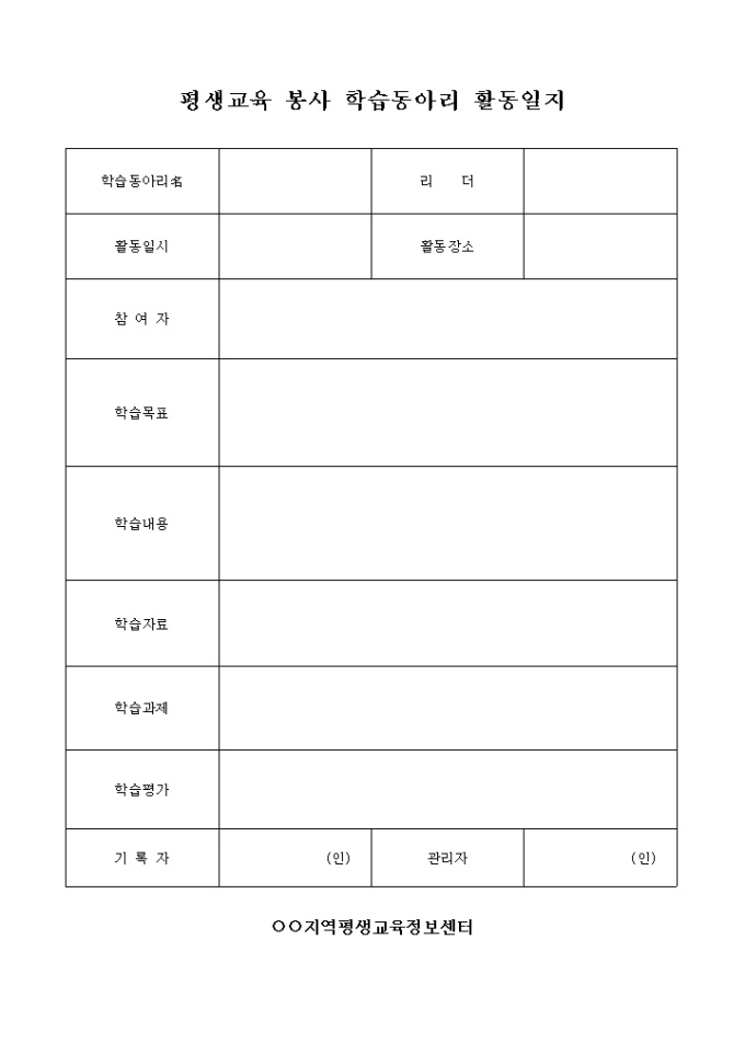 9,000원/월평생교육 봉사 학습동아리 활동일지는 학습목표, 참여자, 활동시간, 장소 및 활동내용, 자료, 과제등을 기록하는 양식입니다.