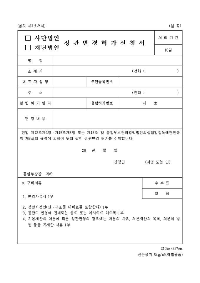 9,000원/월명칭, 소재지, 대표자성명, 등을 기재하며, 민법 제42조제2항·제45조제3항 또는 제46조 및 통일부소관비영리법인의설립및감독에관한규칙 제6조의 규정에 의하여 위와 같이 정관변경 허가신청시 사용하는 양식입니다.