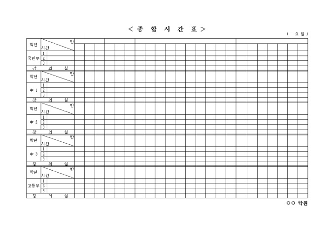 9,000원/월초등학생, 중학생, 고등학생 전체의 시간표를 기록할 수 있는 양식입니다.