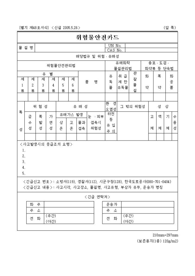 9,000원/월위험물안전카드 양식은 물질명, UN No.,CAS No., 해당법규 및 위험 유해성, 사고발생시의 응급조치 요령, 긴급연락처 등의 항목으로 구성되어 있습니다.