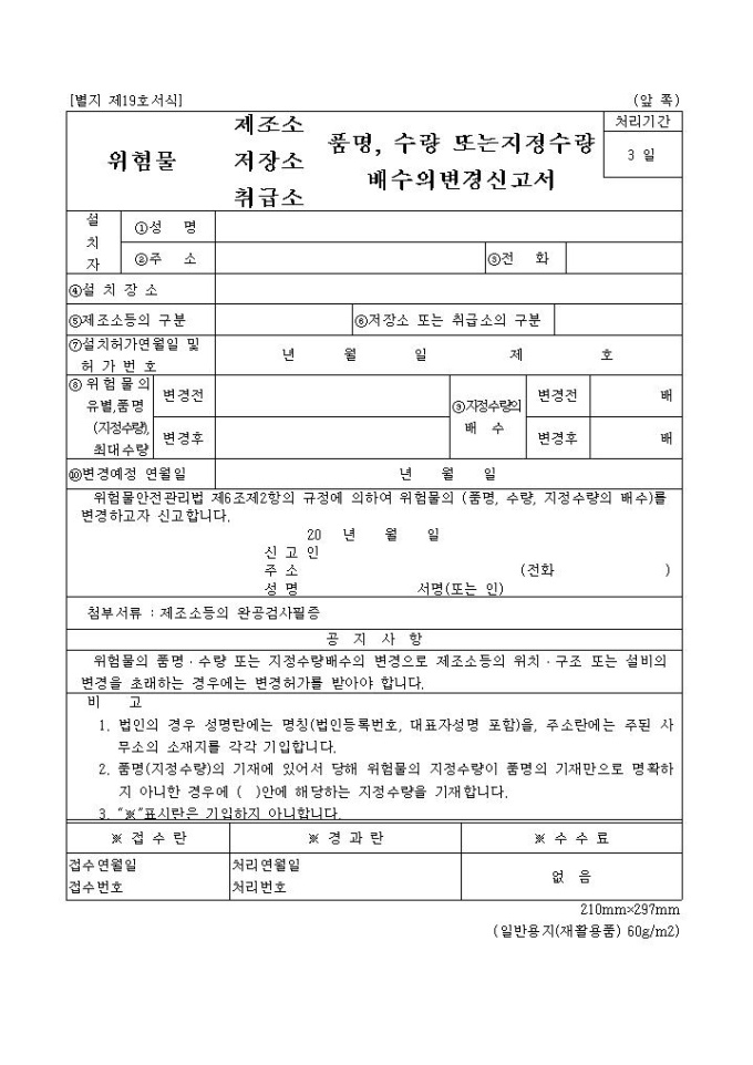 9,000원/월위험물(제조소저장소취급소)품명,수량 또는 지정수량 배수의 변경신고서 양식은 설치자 및 설치장소, 제조소등의 구분, 위헙물의 유별, 품명 최대수량 등의 항목으로 구성되어 있습니다.